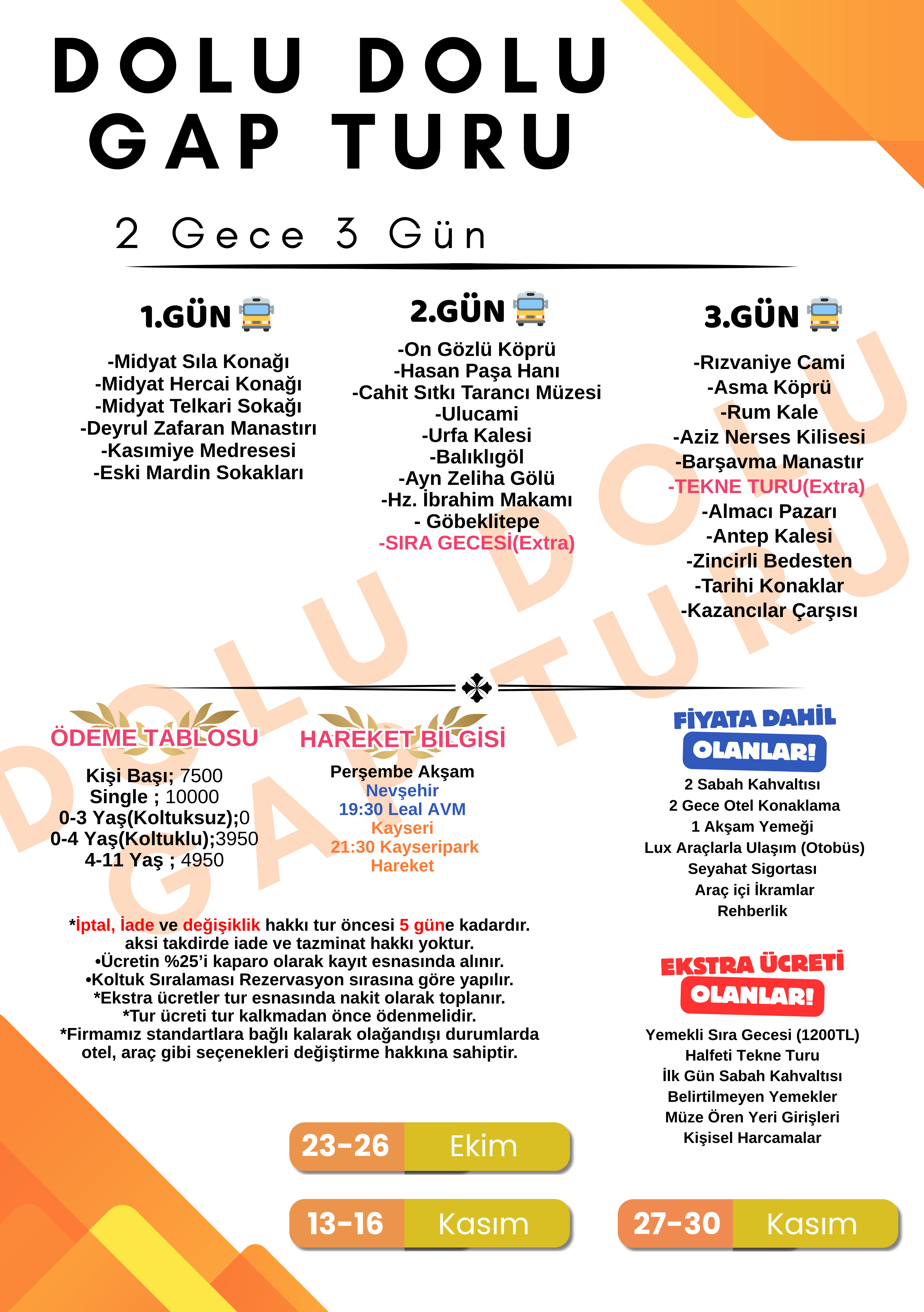 Gezi Süresi 2-Gece 3-Gündür. 2-Gece Otel Konaklaması Yapılacaktır. •Çocuk İndirimleri (Günübirlik Turlarda Uygulanmaz) İki Yetişkin Yanında Bir Çocuk İçin Uygulanır. •2 Yaşından Büyük Çocuklara Koltuk Vermek Kanun İle Zorunlu Hale Getirilmiştir. •2 Yaşından Küçük Çocuklara Koltuk Verilmez, İstenildiğinde Ayrıca Ücretlendirilir. •Tur Rehberi Programı Tamamen Gerçekleştirmek Şartı İle Programın Seyrinde Değişiklik Yapma Hakkını Saklı Tutar. •Paket Turlarımız Yukarıda Belirttiğimiz Hizmetler Dahilinde Bir Bütündür, Ayrı Ayrı Düşünülemez, Kullanılmayan Ulaşım, Çevre Gezileri vb Hizmetlerin Bedel İadesi Yapılmayacaktır. •Rehberimizin Tur Sırasında Verdiği Saatlere Misafirlerimizin Uymaması Sonucunda, Tur Programında Yazdığı Halde Gezilemeyen Yerlerden Acentamız Sorumlu Değildir.